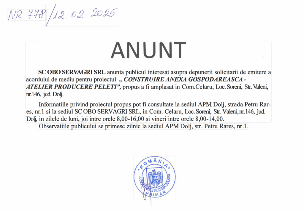 Anunt din data 6.05.2025 – Construire anexa gospodareasca – Atelier peleti